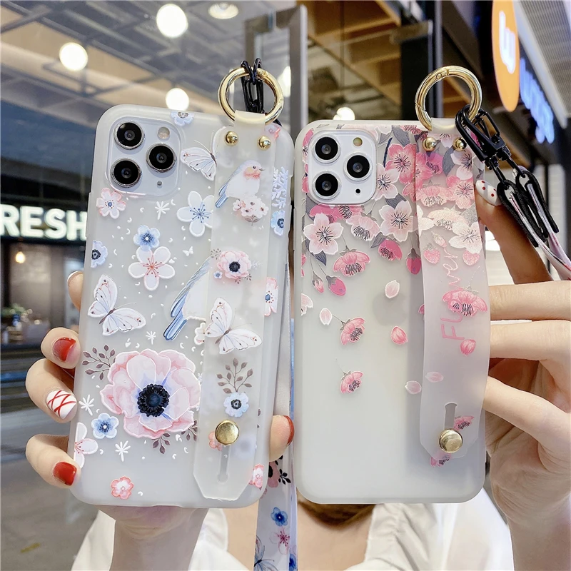 - 3D 릴리프 플라워 손목 스트랩 휴대폰 홀더 케이스, 목 끈, 아이폰 12 13 미니 SE 2 11 프로 맥스 XR XS 6 6S 7 8 플러스 TPU 커버