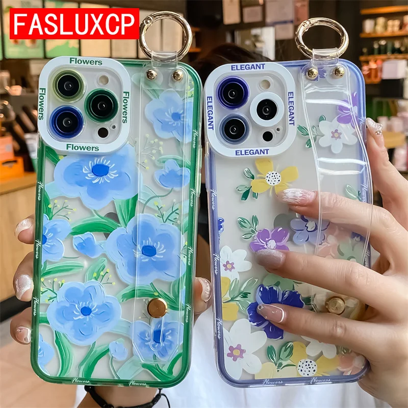 - IPhone 13 Pro 12 용 전화 홀더 케이스 커버 Max 11 SE 3 XR X XS 7 Plus 8 트렌디 한 소프트 아트 플라워 손목 스트랩 스탠드 클리어 쉘