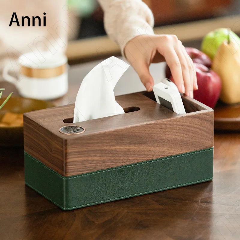 - 호두 나무 티슈 상자 북유럽 현대 다기능 휴대 전화 홀더 종이 타월 보관 상자, 가죽 기본 홈 인테리어