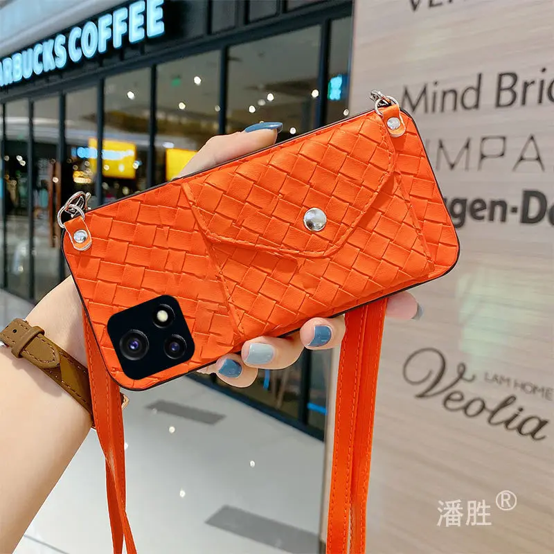 - Simple Balck Orange Woven Strap Crossbody Coin Purse Leather Phone Case for Vivo y85 73s 70s 52s 51s 50 31s Wallet Phone Cover
