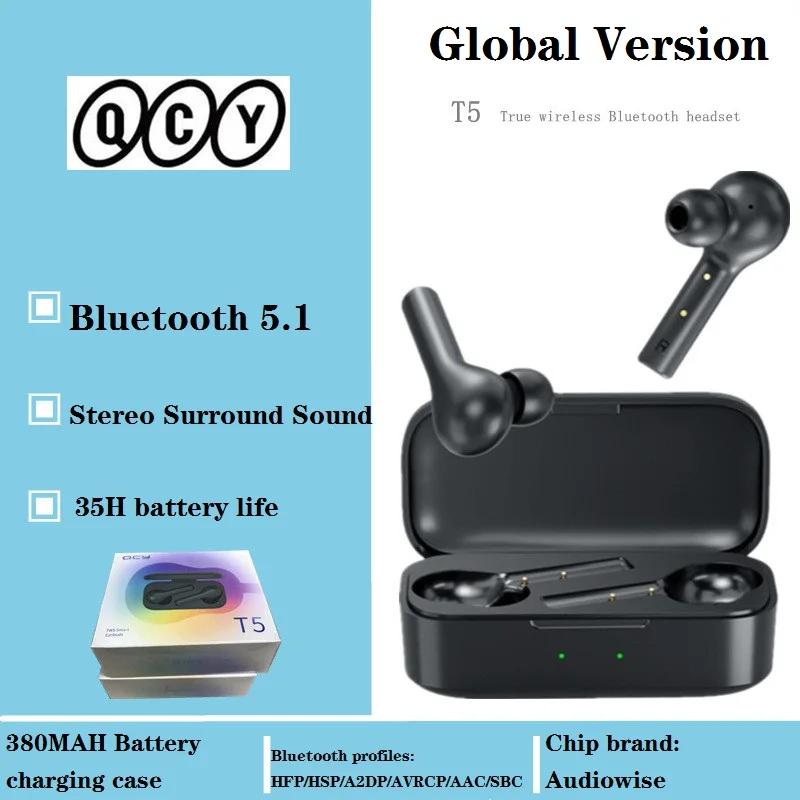 - Global Version QCY T5 Wireless Bluetooth Earbuds TWS Touch Control Earphones Stereo With Microphone 380mah Long Battery