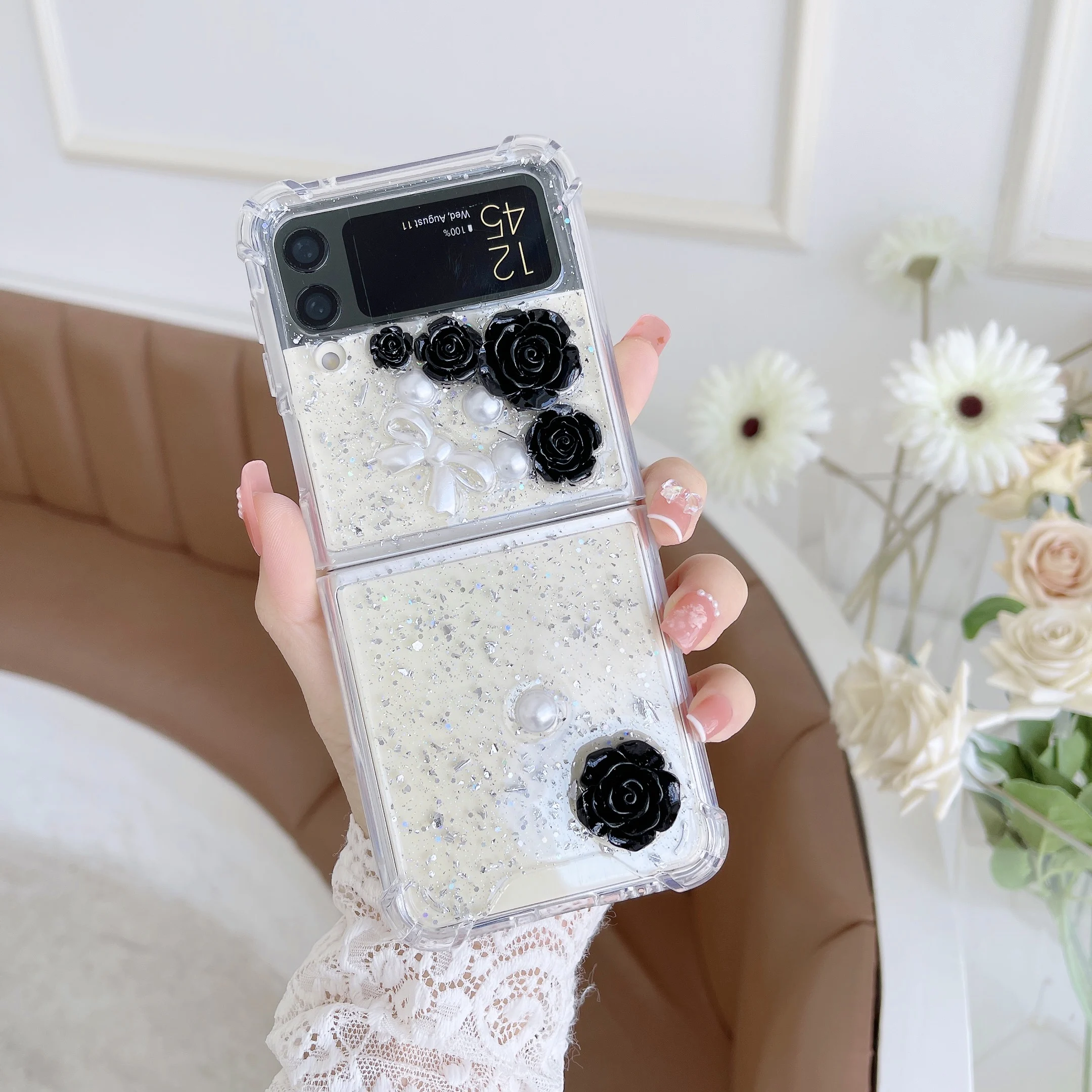 1. 삼성 Z 플립 3 5G TPU 충격 방지 케이스, 투명 3D 로즈 글리터 접이식 전화 케이스, 삼성 Z 플립 4 플립 3 5G